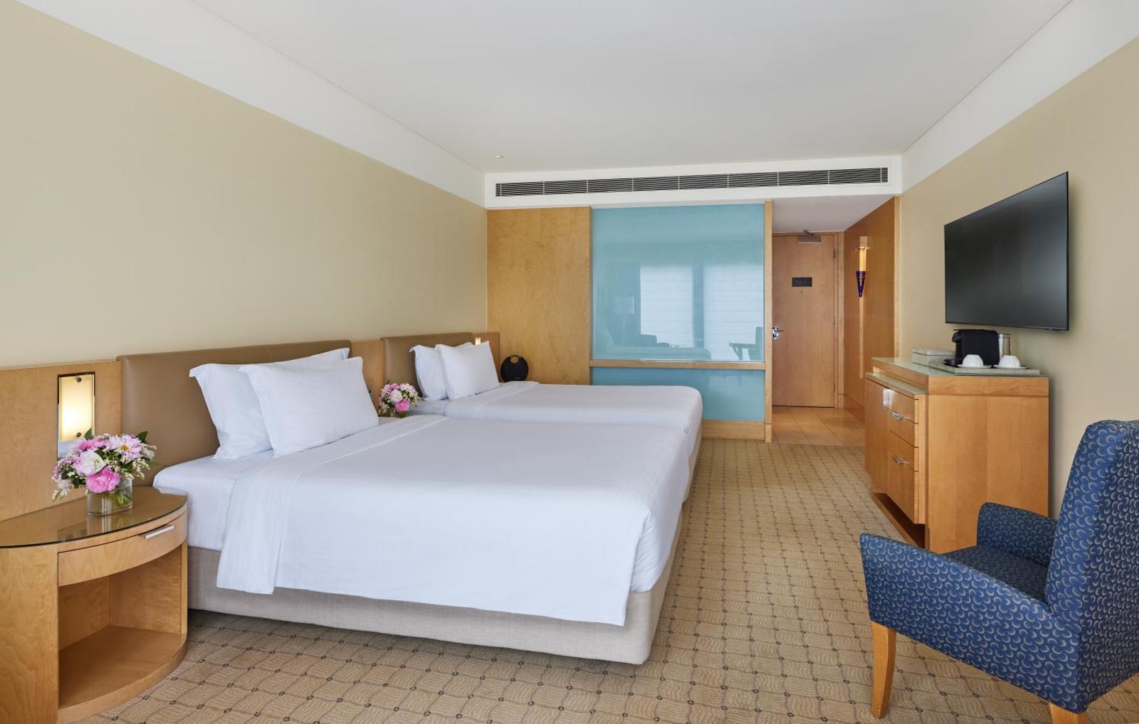 Rooms present a quieter charm: wide windows framing cityscapes, neutral tones, crisp linens, and uncluttered spaces. Suites capture both comfort and sophistication, with separate living areas and elegant furnishings.