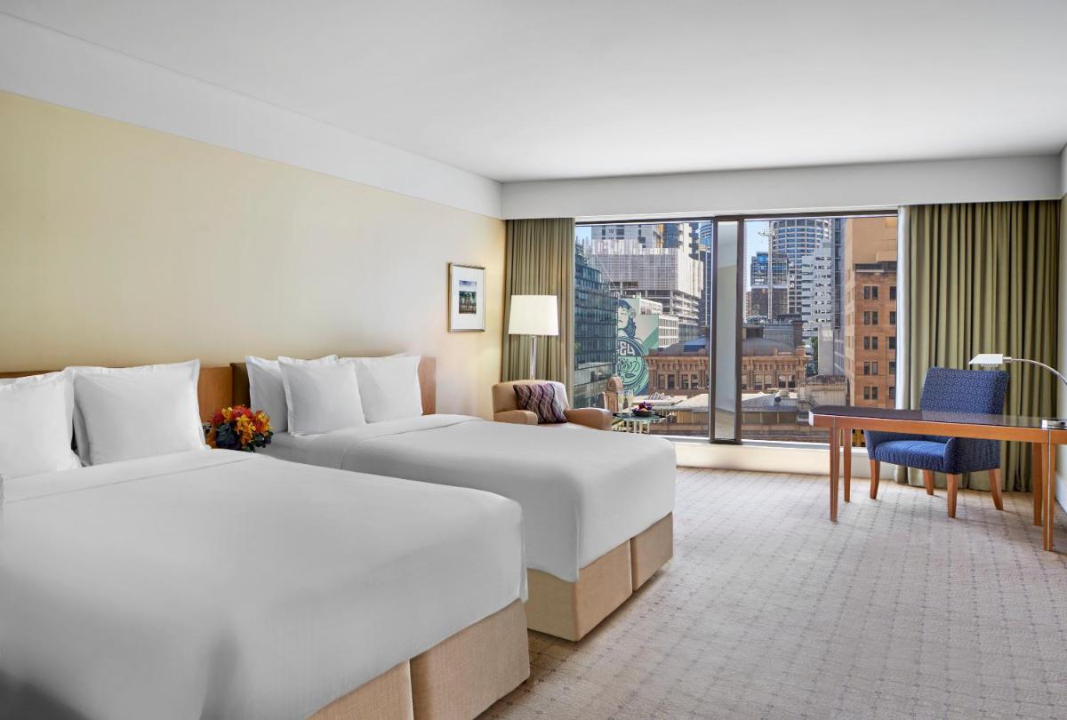 The restaurant is another highlight, photographed with open kitchens and tables arranged beneath vaulted ceilings, while the bar shows its moodier side under low lighting. Fitness areas and meeting spaces appear sleek, efficient, and adaptable. The gallery also captures glimpses of Sydney’s skyline, reminding viewers that the city sits just beyond the hotel doors.